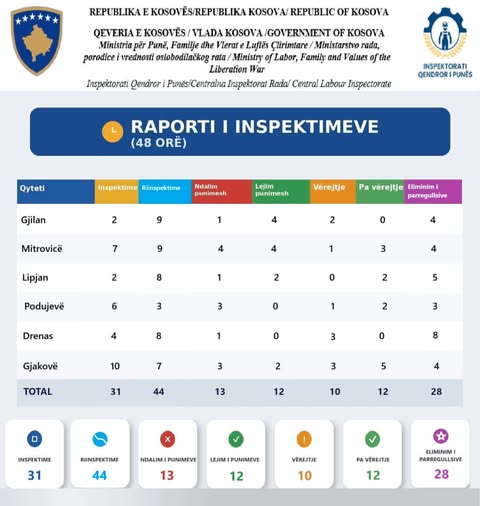 Sipas raportit 48-orësh janë realizuar gjithsej 31 inspektime dhe 44 riinspektime, duke rezultuar me një numër të konsiderueshëm masash ndëshkuese dhe parandaluese ndaj subjekteve që nuk kanë respektuar legjislacionin në fuqi.