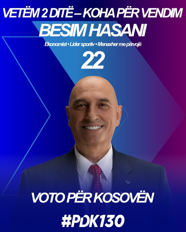 Vetëm dy ditë para zgjedhjeve, kandidati për deputet Besim Hasani ka bërë thirrje për pjesëmarrje dhe vendimmarrje të përgjegjshme. Ai thotë se me përvojë dhe vizion synon t’i shërbejë vendit dhe zhvillimit të Kosovës në Kuvend.