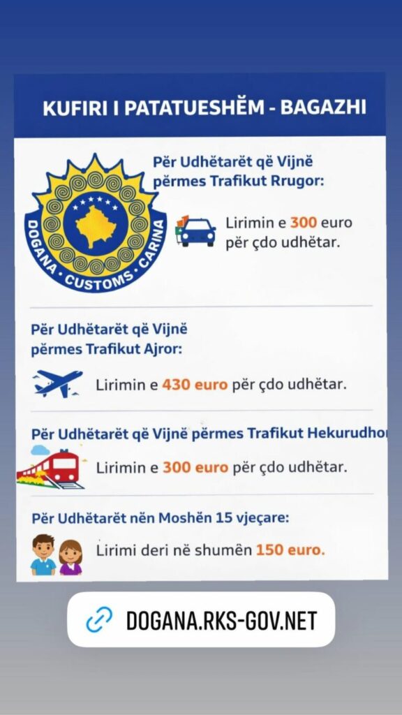 Dogana e Kosovës ka publikuar një njoftim lidhur me kufirin e patatueshëm për mallrat që udhëtarët sjellin me vete në bagazh personal gjatë hyrjes në vend, duke sqaruar rregullat dhe limitet që vlejnë sipas legjislacionit në fuqi.