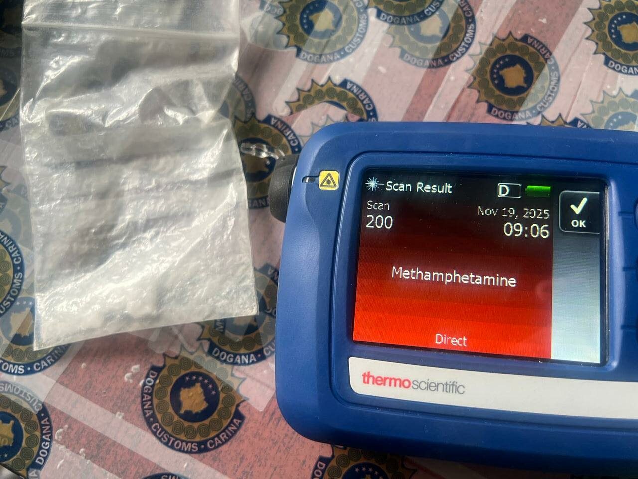 Gjatë kontrollit të një çifti, në çantën personale dhe në veturën e tyre janë zbuluar dy qese që përmbanin rreth 150 gramë substancë të dyshuar narkotike të llojit metamfetaminë.