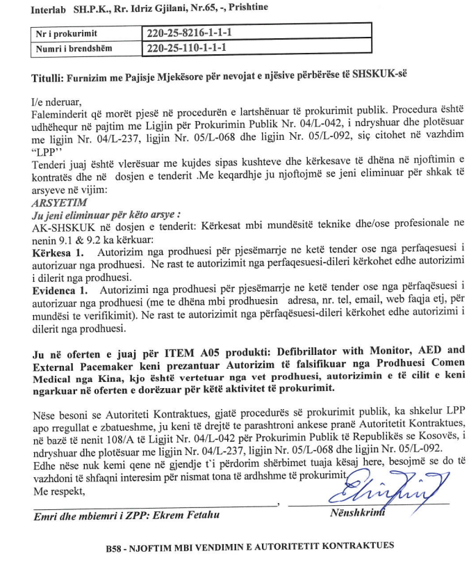“Ju në ofertën e juaj për ITEM A05 keni prezantuar autorizim të falsifikuar nga prodhuesi Comen Medical nga Kina. Kjo është vërtetuar nga vet prodhuesi,” thuhet në njoftimin e SHSKUK-së drejtuar kompanisë Interlab.