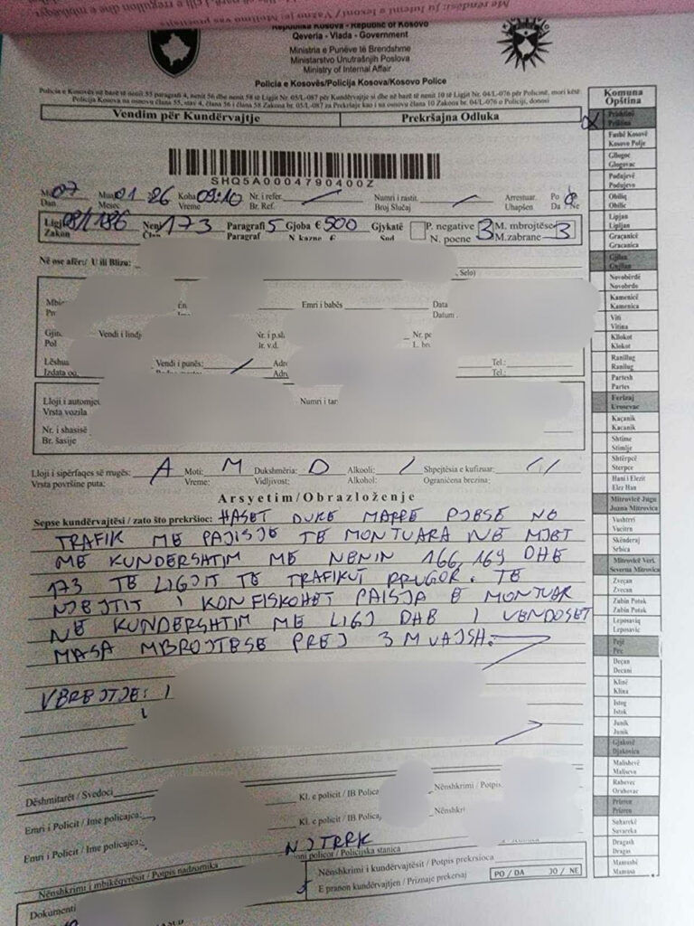 “Prishtinë, 07 Janar 2026– Njësiti i Trafikut të Kryeqytetit ka ndërmarrë veprime policore ndaj një shoferi, i cili ishte hasur duke qarkulluar me automjet, në të cilin kishte vendosur pajisje ndriçuese (drita rotative) në kundërshtim me dispozitat ligjore në fuqi. Gjatë kontrollit në trafik është konstatuar se pajisjet e ndriçimit të vendosura në automjet nuk ishin të lejuara për përdorim, ndërsa shoferi me to kishte dalë në qarkullim, duke shkelur kështu rregullat e trafikut rrugor.”