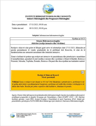 “Bazuar në të dhënat, modelet dhe vëzhgimet e përgjithshme hidrometeorologjike në vend dhe rajon, parashihet që më 18–19 nëntor 2025 të ketë reshje shiu, të cilat në disa zona do të shfaqen me intensitet të lartë”, thuhet në komunikatën e Institutit.