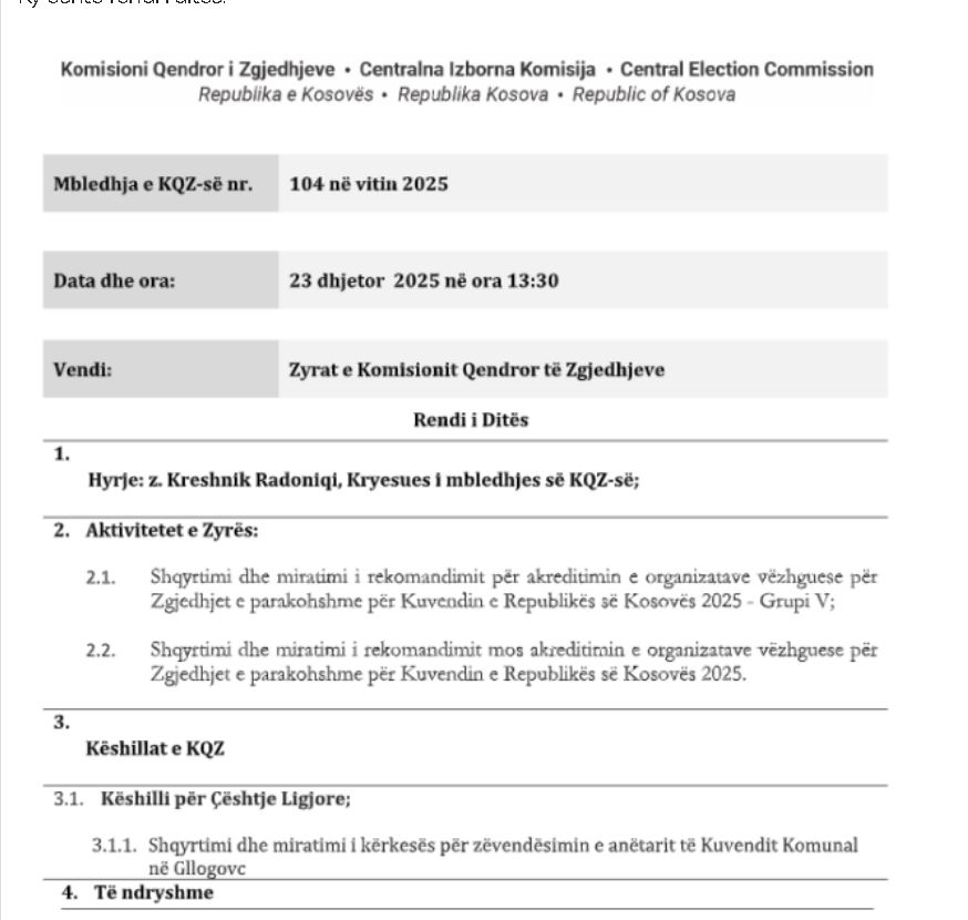 Komisioni Qendror i Zgjedhjeve do të mbajë mbledhje sot nga ora 13:30.
