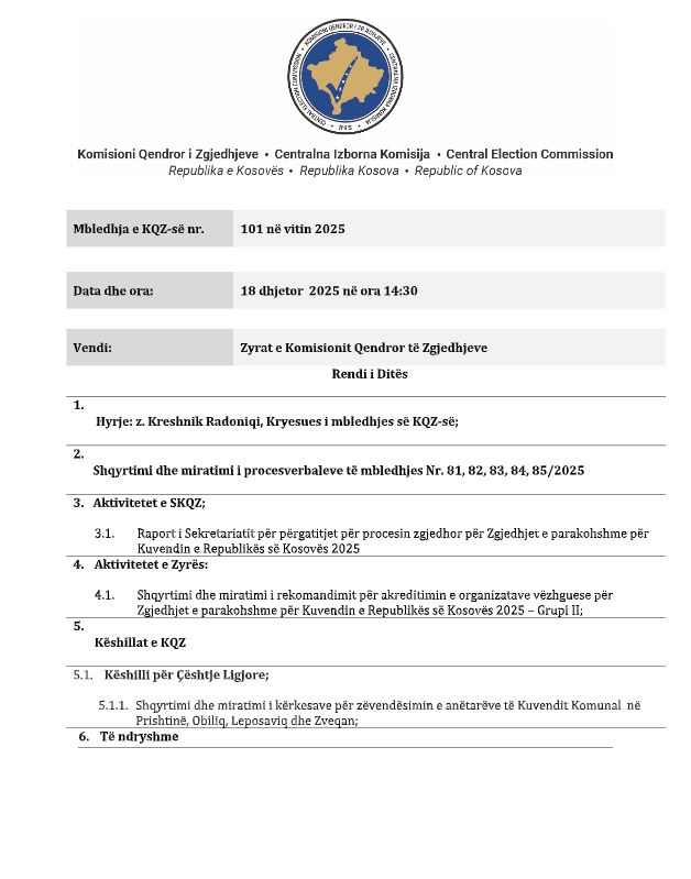 Sipas njoftimit të KQZ-së gjatë mbledhjes do të shqyrtimi dhe miratimi i rekomandimit për akreditimin e organizatave vëzhguese për zgjedhjet.