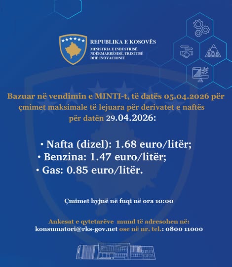 Ministria e Tregtisë dhe Industrisë ka publikuar çmimet e derivateve të naftës për datën 29.04.2026.