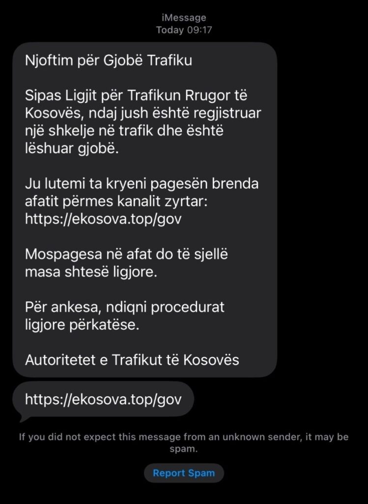 Policia e Kosovës njofton qytetarët për një fushatë mashtruese që aktualisht po qarkullon përmes mesazheve SMS, të cilat në mënyrë të rreme pretendojnë se janë dërguar siq shkruhet nga autoritetet e trafikut të Kosovës. Këto mesazhe përmbajnë linçe mashtruese, të cilat synojnë të mashtrojnë qytetarët.