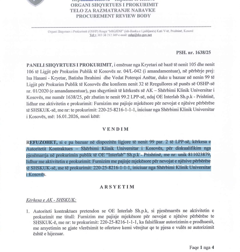 Mirëpo në ankesën e Kompanisë në fjalë në Organin Shqyrtues të Prokurimit (OSHP) është REFUZUAR si e pa bazuar në dispozitën ligjore të nenit 99 par. 2 të LPP-së, kërkesa e Autoritetit Kontraktues – Shërbimi Klinik Universitar i Kosovës, për diskualifikim nga pjesëmarrja në prokurimin publik të OE “Interlab” Sh.p.k – Prishtinë, me nr: unik 811023879, lidhur me aktivitetin e prokurimit: Furnizim me pajisje mjekësore për nevojat e njësive përbërëse të SHSKUK-së, me të prokurimit: 220-25-8216-1-1-1, iniciuar nga Shërbimi Klinik Universitar