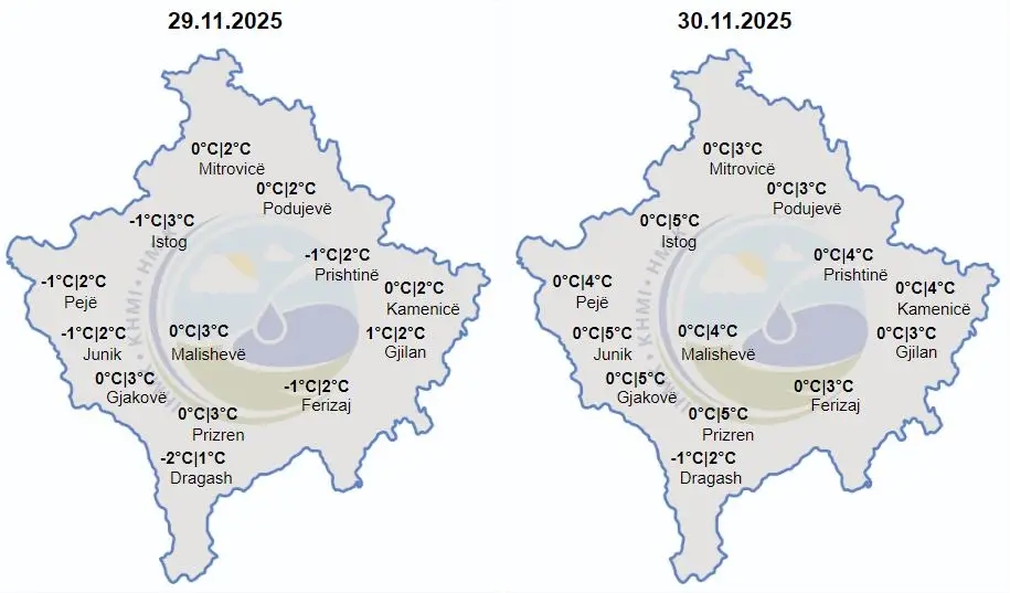 Të shtunen parashihet të mbajë mot kryesisht i vranët dhe vende-vende me riga shiu të përziera me borë, në viset e larta reshje bore.Temperaurat minimale do të lëvizin ndërmjet -2 deri 0 gradë Celsius, ndërsa maksimalet e ditës parashihen të lëvizin ndërmjet 1-3gradë Celsius.Do të fryjë erë nga veriperendimi e lehte deri mesatare.