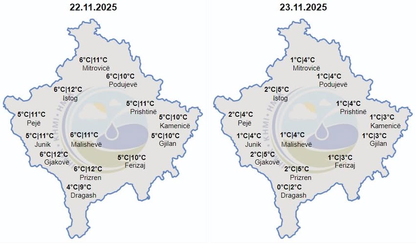 Të shtunen parashihet të mbajë mot kryesisht i vranët dhe me reshje shiu.Temperaura minimale do të lëvizin ndërmjet 4 deri 6 gradë Celsius, ndërsa maksimalet e ditës parashihen të lëvizin ndërmjet 9-12 gradë Celsius. Do të fryjë erë nga veriperendimi e lehte deri mesatare.