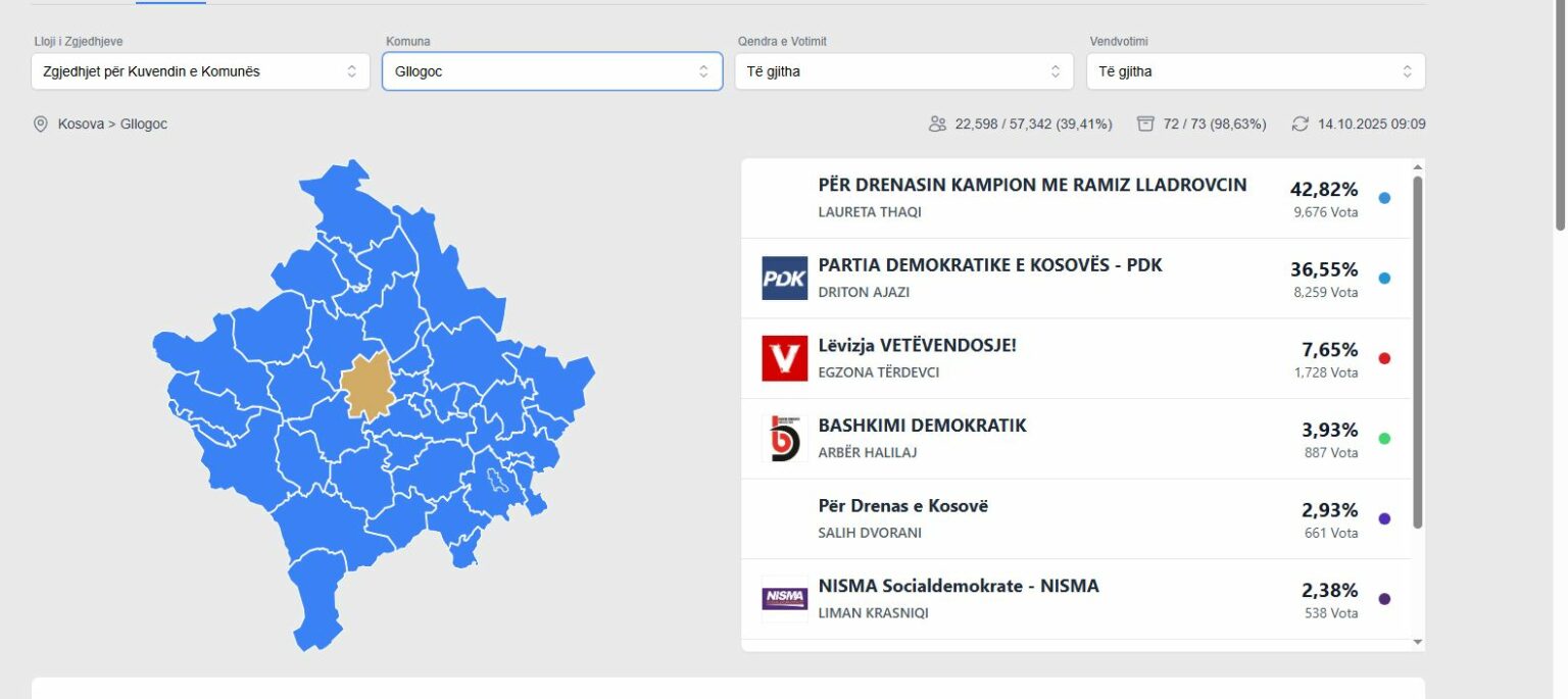 Kjo pasi që pas numërimit të 72 kutiave nga 73 në total, PDKRLL ka arritur që të sigurojë 42.82 % apo 9 mijë e 676 vota.