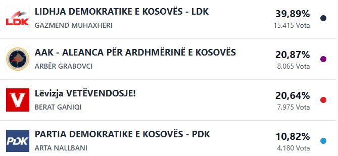 Sipas KQZ-së, atje prin Lidhja Demokratike e Kosovës që ka marrë 15 mijë e 415 vota apo 39.89 për qind.