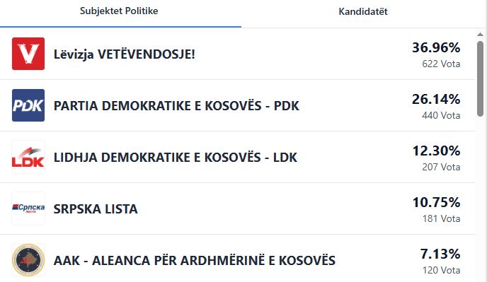 Sipas të dhënave nga Komisioni Qendror i Zgjedhjeve, e para renditet Lëvizja Vetëvendosje me 36.96 për qind apo 622 vota.