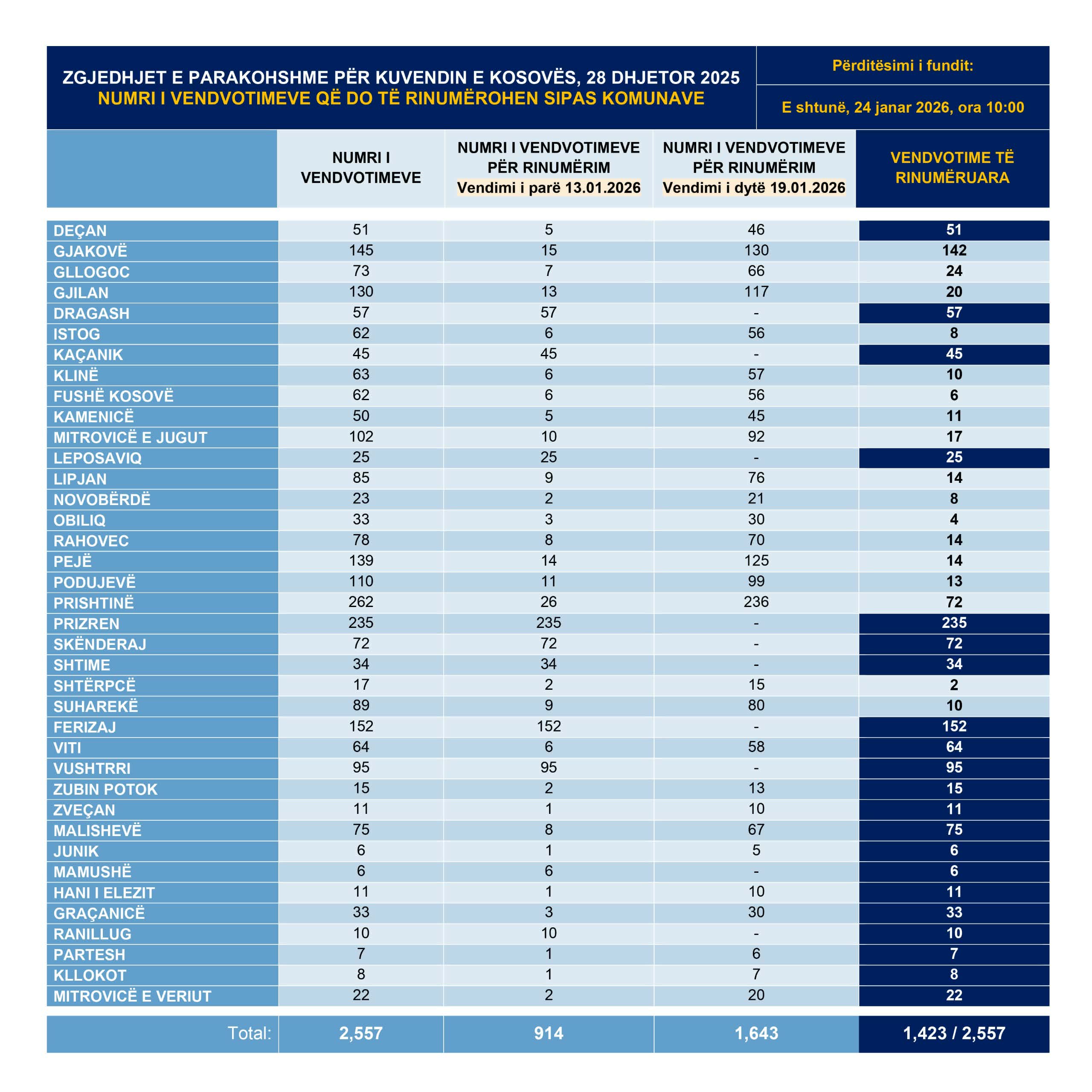 “Nga fillimi i këtij procesi (e martë, 13 janar 2026, ora 18:00) dhe deri më tani (e shtunë, 24 janar 2026, ora 10:00) janë rinumëruar mbi 55% apo 1,423 nga 2,557 vendvotime”, ka njoftuar Zëdhënësi i KQZ-së, Valmir Elezi.