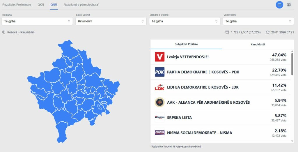Nga fillimi i procesit më 13 janar 2026 dhe deri sot, 26 janar, janë rinumëruar 1.729 vendvotime nga gjithsej 2.557, që përbën 67.62% të totalit të votave.