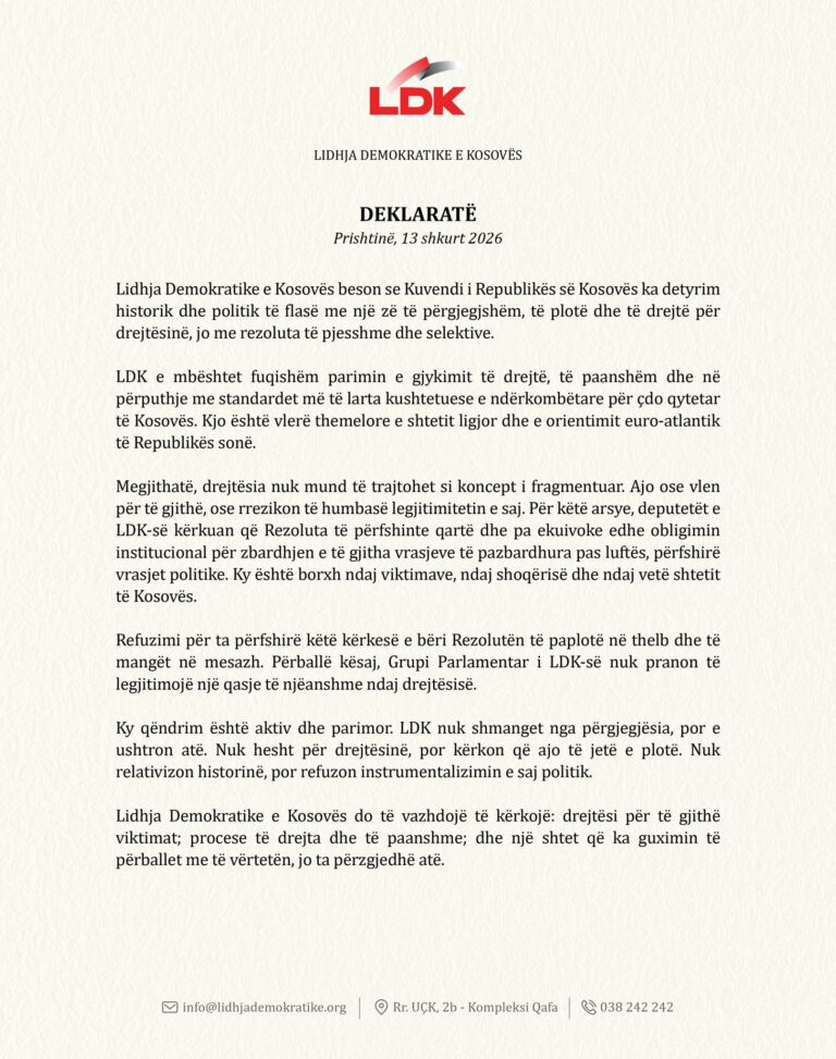 “Lidhja Demokratike e Kosovës beson se Kuvendi i Republikës së Kosovës ka detyrim historik dhe politik të flasë me një zë të përgjegjshëm, të plotë dhe të drejtë për drejtësinë, jo me rezoluta të pjesshme dhe selektive.