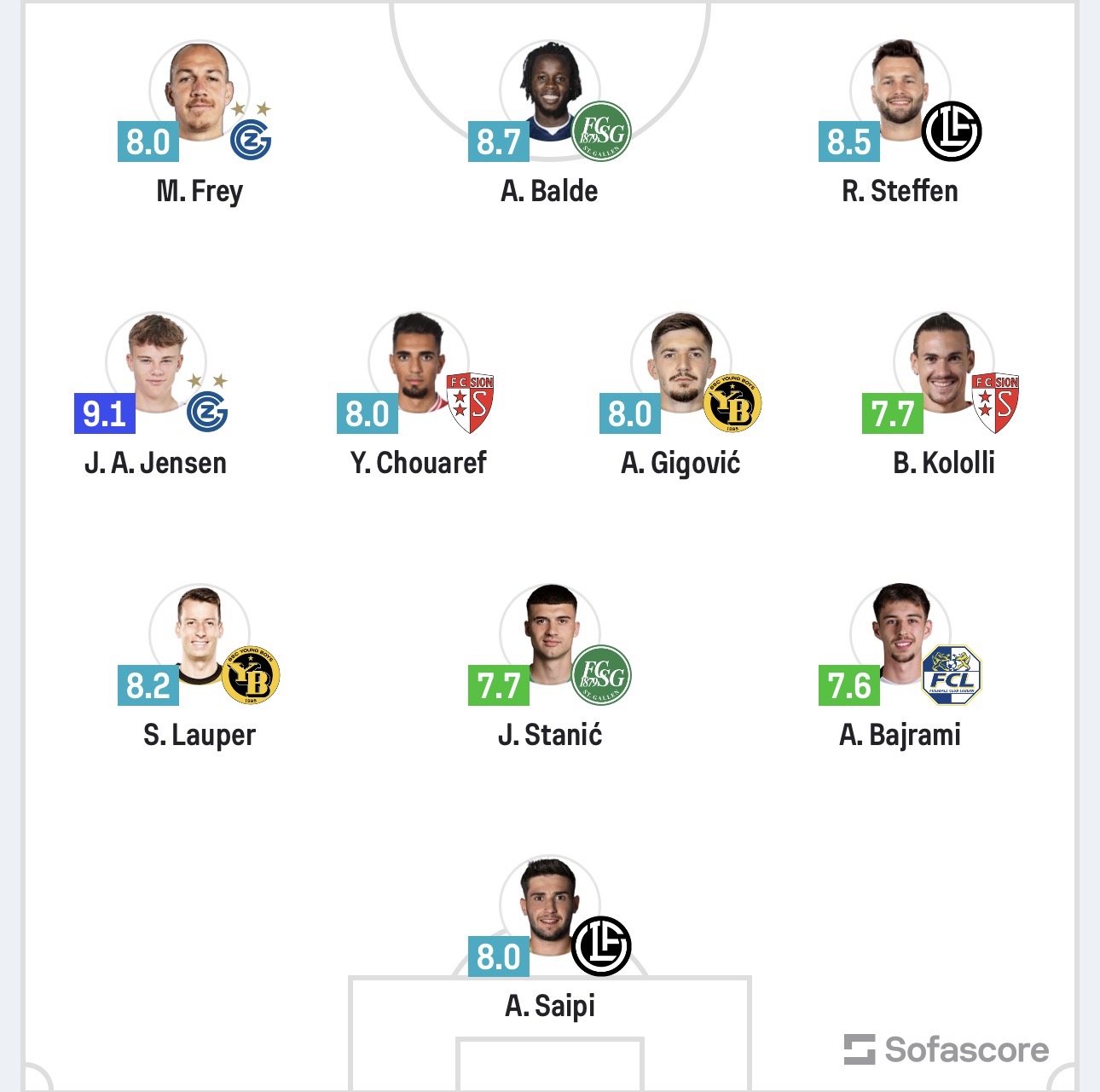 Tre lojtarë shqiptarë janë futur në formacionin e javës në elitën e futbollit zvicran. Bëhet fjalë për Amir Saipin, Benjamin Kolollin dhe Adrian Bajrami, Saipi u vlerësua me notën 8.0, Kololli me notën 7.7, kurse Bajrami me notën 7.6. Lëvizje te postimet Manchester United-Leeds ndeshja që mbyll xhiron e 32-të në Ligën Angleze