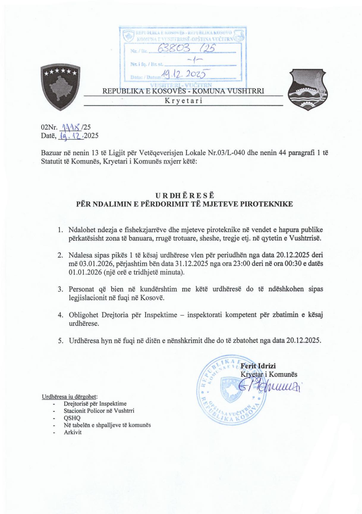 Kryetari i Komunës së Vushtrrisë, Ferit Idrizi, ka nxjerrë urdhëresë për ndalimin e përdorimit të mjeteve piroteknike në vendet e hapura publike.