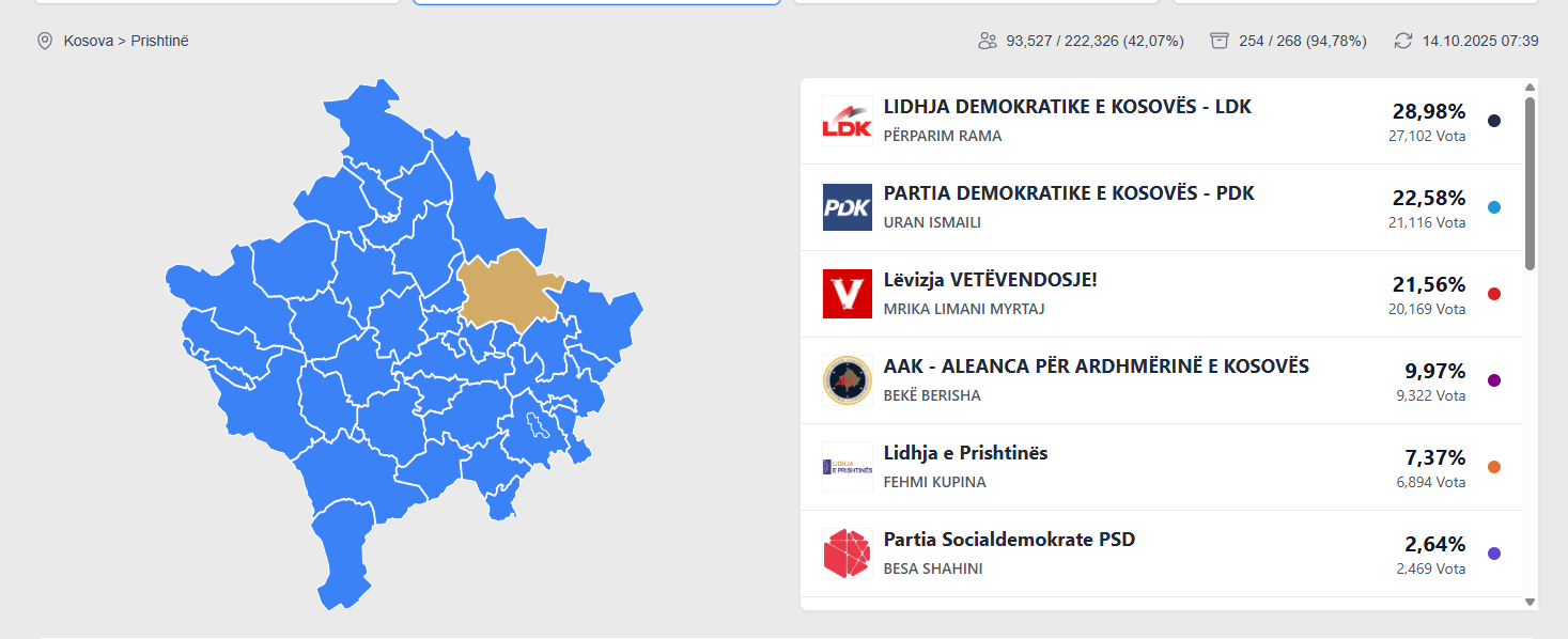 Sipas tabelës aktuale, Lidhja Demokratike e Kosovës është e para me 27 mijë e 102 vota, Partia Demokratike e dyta me 21 mijë e 116 vota, pasuar nga VV-ja me 20 mijë e 169 vota.